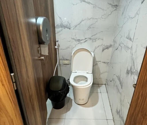 トイレットペーパーは流せないので、となりの黒いゴミ箱に捨てます。