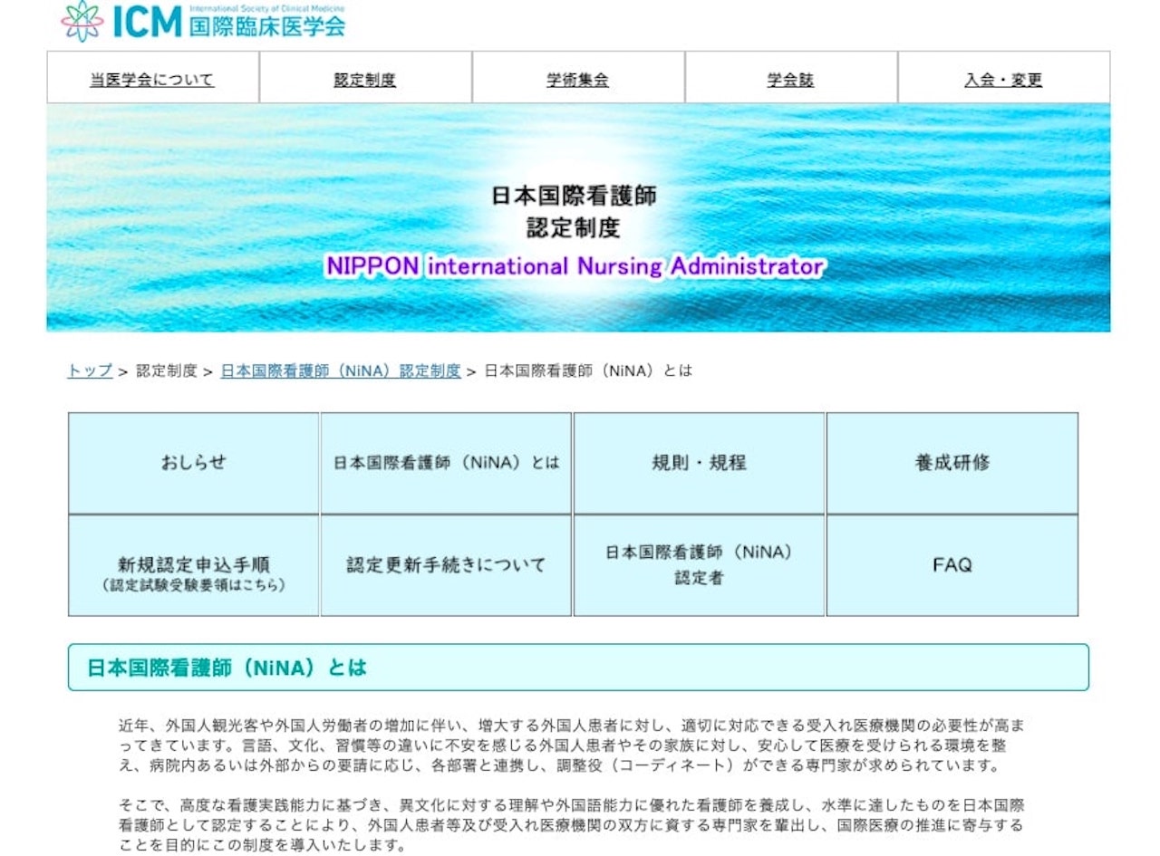 さらに、最近「日本で活躍する国際看護師」として新しくできたものが、日本国際看護師(NiNA)認定制度です。日本にいても、グローバルな視野を持って働く看護師が求められる世の中になっています。