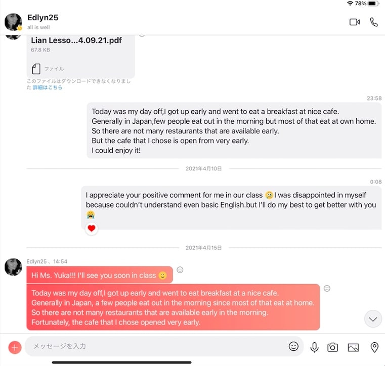 実は、レッスンがはじまる前に講師に英語日記を送っていたんです。